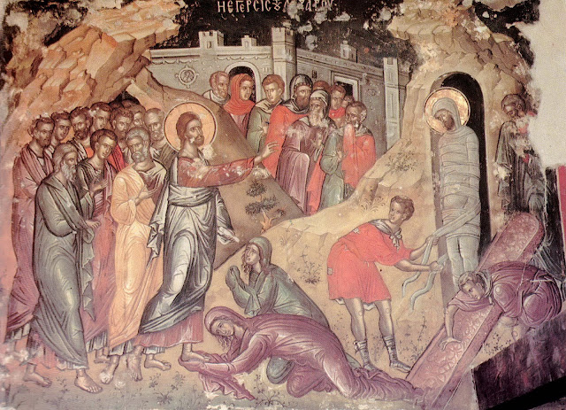 Învierea lui Lazăr (fratele Martei şi Mariei), cinstită în ajunul Floriilor (Sîmbăta lui Lazăr - mare zi de pomenire a morţilor), constituie un preludiu important al Învierii Domnului. Troparul sărbătorii spune: “Învierea cea de obşte mai înainte de Patima Ta încredinţînd-o, pe Lazăr l-ai înviat, Hristoase, Dumnezeule”. Dojenind-o pe Marta pentru îndoiala ei (“Nu ţi-am spus că dacă vei crede, vei vedea slava lui Dumnezeu?” – Ioan 11, 40), Domnul pune să se ridice piatra de la gura mormîntului şi-l strigă cu glas mare pe cel de patru zile aşezat în el: “Lazăre, vino afară!” (Ioan 11, 43). Şi mortul iese viu la lumină, făcându-i să se cutremure pe toţi cei de faţă, iar pe arhierei şi pe farisei să zică: “Ce ne facem, pentru că Omul Acesta săvîrşeşte multe minuni?” (Ioan 11, 47).