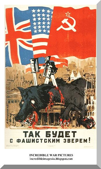 Ce faceau americanii de capul lor ca urmare a acelei aliante, ei stiau, ca doar trebuiau sa creeze impresia necesara....insa de asteptat au asteptat cu MULT dupa punctul in care le-a FOST CLAR ca RUSII vor ajunge invingatori la Berlin....si pentru a-i opri sa "elibereze" si restul Europei pina la Atlantic...au intrat in actiune rapida, disperata, chiar cu pretul unei debarcari dezastruoase, asa cum a fost cea din Normandia. |