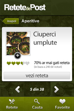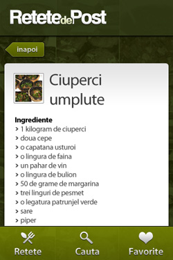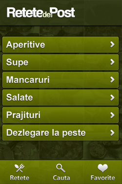 O aplicatie care iti pune la dispozitie cele mai bune retete de post: Aperitive, Salate, Supe, Mancaruri, Dulciuri si retete pentru zilele in care avem dezlegare la peste.