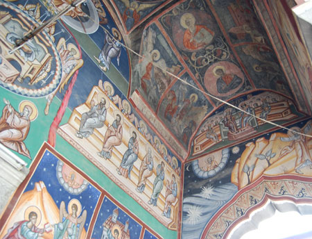 Intreaga podoaba de pictura in fresca, ce imbraca biserica, acopera o suprafata de 750 de metri patrati. Pictura interioara initiala, in fresca, a fost acoperita cu o alta in ulei, de catre pictorul G. Ioanid, la anul 1880. Sub indrumarea Comisiei Monumentelor Istorice s-au dat la iveala, in absida stanga a naosului, chipurile zugravite in fresca, initiale, ale Sfantului Mucenic Teodor Tiron, Sfanta Teodora si Sfantul Mercurie.