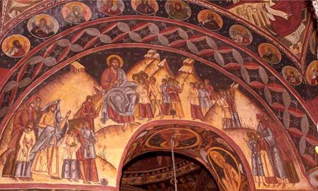 Pe arcul dinspre vest, in intrados gasim medalioane cu martiri, iar mai jos pe pilastri cate un mucenic si ierarhii Spiridon si Vasile (o dispunere neobisnuita pentru ierarhi). Zona dintre naos si pronaos (de aici spre vest este doar pictura noua) e decorata cu scene din care am descifrat "Botezul Domnului". In mod asemanator, arcul dinspre pronaos contine scene cu minuni, pilde si vindecari, iar jos arhanghelii Mihail si Gavril (nord si sud).