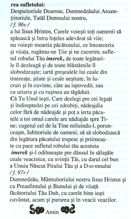 " Grija Bisericii fata de omul aflat in clipa mortii Exista insa situatii cand muribundul traieste dramatic si sfasietor ultimele clipe ale vietii. In astfel de situatii cand trupul se stinge, fara ca sufletul sa se desparta de trup, agonia mortii este chinuitoare nu doar pentru muribund, dar mai ales pentru familie, pentru cei apropiati. In general, Biserica a tratat astfel de situatii ca exceptionale: muribundul nu primeste eliberarea intrucat are pe constiinta pacate grave, nemarturisite, care-i apasa greu constiinta. Acest aspect a dat nastere unui ritual penitential complex: In general, atat in Rasarit cat si in Apus, grija in fata mortii se manifesta pe de-o parte, printr-o rugaciune insistenta cu privire la pacatele nespovedite, pe de alta parte prin grija acordarii Ultimei Impartasanii. In Rasarit, clipa mortii anula toate oprelistile: penitentilor li se permitea in clipa mortii sa aiba acces la o Ultima Impartasanie iar in Apus, acelasi lucru il implinea ritualul viaticum-ului. Pentru a vedea care era randuiala liturgica in clipa mortii in Transilvania, in situatiile prezentate, am studiat si transliterat textul randuielii din Molitfelnicul de la Balgrad 1689. Molitfelnicul de la Balgrad (1689), una dintre primele cartile de cult romanesti. Balgradul medieval a avut o importanta covarsitoare in formarea si consolidarea limbii literare romanesti. In atmosfera luminilor ce razbatea din Europa, o seama de principi calvini si-au indreptat atentia si asupra supusilor romani ortodocsi. Dorinta de a le da scoli si carti in limba romana - nu intotdeauna sincera - a creat poate premizele nasterii sentimentului national al Scolii Ardelene de mai tarziu. Fara a intra in polemica privind intentia acestor principi, trebuie sa recunoastem ca aceasta a fost scanteia care a determinat explozia tipariturilor romanesti din Transilvania sec. XVII. Desi n-au avut poate cadenta celorlalte centre tipografice din Tarile Romane, teascurile mitropoliei balgradene au dat la iveala, in grai romanesc, cele mai insemnate carti pentru cultura romana: Noul Testament (1648); Psaltirea (1651) si Molitfelnicul (1689). Eficient, despre primele doua s-a scris mult in literatura de specialitate si chiar au fost editate in editii critice (Noul Testament - 1989; Psaltirea - 2001), Molitfelnicul asteapta inca editia critica ce-i va dovedi, suntem convinsi, valoarea si importanta in randul cartilor care stau la temelia neamului. Nu spunem acest lucru doar de dragul intregirii un triptic, ci datorita faptului ca molitfelnicul, spre deosebire chiar de Noul Testament sau Psaltire, a fost cartea care a purtat graiul romanesc in casele oamenilor deoarece el cuprinde rugaciuni folositoare la Despre Molitfelnicul de la Balgrad stim ca este a treia editie/varianta in limba romana dupa cel al diaconului Coresi (Brasov, 1564) si cel al mitropolitul Dosoftei (Iasi, 1681). Din Cuvantul inainte aflam ca traducerea sa a fost facuta dupa un izvod slavonesc si a fost tiparit cu blagoslovenia mitropolitului Varlaam si cu acordul principelui Mihail Apafi, Datorita continutului sau bogat, in comparatie cu precedentele editii, Molitfelnicul de la Balgrad poate fi considerat primul Molitfelnic in adevaratul sens al cuvantului. Poate tocmai din acest motiv, Molitfelnicul lui Zoba a cunoscut mai multe editii si a fost pentru multa vreme una dintre cele mai copiate texte in Transilvania, si nu numai. Slujba la iesirea cu greu a sufletului In general majoritatea textelor randuielilor prezentate de Molitfelnicul lui Zoba sunt mult mai potrivite si mai logice, in situatii concrete, fata de textele Molitfelnicelor de azi. Doar un exemplu: La A doua Cununie textele liturgice ii faceau pe miri sa simta dojana Bisericii (conform perceptiei liturgico-canonice doar Prima Cununie este considerata Taina in adevaratul sens al cuvantului). Astfel, textul Evangheliei (Mt. 19, 3-12: Se cuvine, oare, omului sa-si lase femeia sa, pentru orice pricina?) sublinia ca omul nu se poate desparti din motive frivole, mirii nu erau impartasiti iar cununa pe cap primea doar cel care n-a mai fost niciodata casatorit. Randuielile de azi prevad doar o slujba mai scurta, cu aceleasi lecturi si gesturi (cununi, paharul de obste, inconjurarea rituala) s.a. ceea ce face sa para ca este aceeasi sluiba; ba chiar in conditiile secularizarii si grabei de azi, pare chiar mai convenabila decat prima. Schematic, randuiala este foarte simpla, desi textul este mai lung, datorita Canonului de rugaciune. Slujba debuteaza cu indrumari tipiconale care recomanda un dialog - Ca si in toate editiile succesive, slujba incepe cu Binecuvantarea mica, urmata de Rugaciunile incepatoare, Doamne miluieste de 12 ori si Psalmul 50 cu introducere Veniti sa ine inchinam.. Incepand din secolul urmator randuiala mai z cuprinde si Psalmii 69 si 142. Partea cea mai importanta a Randuielii la Iesirea cu greu a sufletului este compusa din Canonul de rugaciune; aceasta este si partea cea mai fluctuanta a acestei slujbe in editiile succesive ale Molitfelnicului. Daca Blg. 1689 aseaza in text un Canon de rugaciune catre Preasfanta Nascatoare de Dumnezeu - glas 4, din secolul urmator toate editiile cercetate de noi (Targ. 1713; Buc. 1742; Sib. 1849) cuprind drept Canon alte texte, neidentificate. Spre deosebire de Blg. 1689 sau de celelalte editii pomenite, Blj. 1815, prezinta o a treia varianta de text, punand canonul de rugaciune sub numele Sfantului Andrei Criteanul, totusi, din studiile intreprinse de noi, doar irmoasele sunt luate din Canonul cel Mare al Sfantului Andrei Criteanul, celelalte texte ramanand neidentificate de catre noi. In ceea ce priveste editia de Balgrad, 1689, comparand textele care mi-au stat la indemana, nu am reusit sa identific sursa textului decat pentru irmoase: acestea sunt luate de la Canonul de sambata, glas 6 si pentru condac, luat din Canonul cel Mare al Sfantului Andrei Criteanul. Ramane ca o cercetare ulterioara si amanuntita a celorlalte editii ale Molitfelnicului sa identif