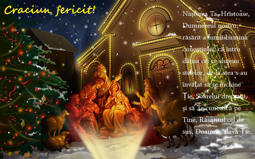 „Nașterea Ta, Hristoase, Dumnezeul nostru, răsărit-a lumii Lumina cunoștinței; că întru dânsa cei ce slujeau stelelor, de la stea s-au învățat să se închine Ție, Soarelui dreptății, și să Te cunoască pe Tine, Răsăritul cel de sus, Doamne, slavă Ție!“ (Troparul Nașterii Domnului) Hristos Se naște, slăviți-L! Hristos din ceruri, întâmpinați-L! |