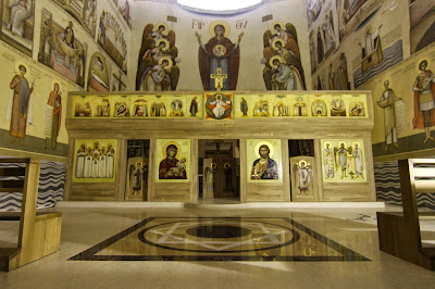 Dar si cateva detalii de arhitectura, foarte originale, pline de semnificatii arhetipale. Ma refer la efectul ondulat, de pergament, de rotulus desfacut, al peretilor dinauntru, ce-si unduiesc imaginile care parca curg fluid una din alta, ruland dinspre altar ca un manuscris antic desfacut. Perceputa dinspre exterior ca arca a lui Noe, morfologia acestei interesante biserici pare ca se modifica cand intri inauntru. Primul efect vizual e cel de care ziceam, de poveste a lumii in imagini, inscrisa pe un pergament desfacut, iar pe masura ce privirea (launtrica) ti se inalta, sesizezi ca ia forma buzei unui potir. Imi da senzatia unui interior dinamic si dinamizant, menit, as zice, chiar si prin versatilitatea morfologiei arhitecturale sa-i scoata pe credinciosii prea focusati pe ancora de care se tin alipiti de cele ale lumii, sa-i scoata deci, din inertia incremenirii la mal. Imbarcandu-te in corabia cu Sf. Mandylion, te descoperi uimit inauntru, de parca ai fi intr-un sfant potir cosmic, laolalta cu Hristos si sfintii biruitori, dar si cu luptatorii inca vaslind spre eshaton printre valurile lumii. O metafora plastica a Imparatiei in ipostaza ei de "deja si nu inca". Citat:
