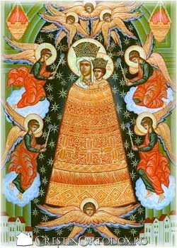 Maica Domnului si Pruncul Iisus sunt zugraviti in picioare, avnd trupurile in intregime infasurate sub aceeasi mantie, pe fundalul unui cer de noapte instelat. Capetele lor, acoperite cu coroane de aur, ies din partea de sus a unui trunchi de con, reprezenand mantia care-i infasoara laolalta. Aceasta este decorata cu diverse ornamente, sub forma de cruce, de floare; pe ea pot fi cusute broderii si aplicate pietre pretioase si perle. Pruncul Iisus face gestul binecuvntarii cu mna dreapta.