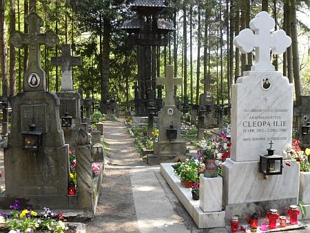 In mijlocul cimitirului, ca pe un tron, sunt asezate mormintele marilor duhovnici de la Sihastria: parintele Paisie Olaru si parintele Cleopa Ilie. Acestea stralucesc prin harul ce izvoraste din ele. Parintele Paisie continua si acum sa pastoreasca si sa ajute, cu blandete si dragoste, pe cei care ii cer ajutorul.
