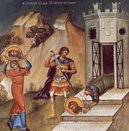 La un mare ospat, cu mancaruri grase, cu vinuri si bauturi aromate, cu dansuri si alte desfatari, Salomeea, fiica Irodiadei, a castigat inima regelui, care i-a zis ca ii va da orice ii va cere, pana la o jumatate din imparatia sa. Fata fara minte a intrebat-o pe mama ei ce sa care, iar aceea, din pizma si ura, a cerut Capul Sfantului Ioan Botezatorul. Nebunul rege a ascultat pe fata, poruncind taierea capului sfantului, in inchisoare. Capul Sfantului Ioan a fost adus pe o tipsie (tava) si dat fetei, care l-a dat mamei sale.