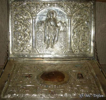 "O, prealaudate mucenice Trifon, asculta smerita noastra rugaciune, pe care ti-o aducem din toata inima, si ne izbaveste pe noi din boli si din primejdii, pe noi, cei ce cinstim pomenirea ta si marturisim minunile savarsite de tine cu darul Sfantului Duh. Indrepteaza pasii nostri spre lumina Invierii lui Hristos si ne poarta de grija din inalt, sa nu ne aflam coplesiti de valurile lumii, ci, cu privirea atintita spre Hristos, sa ajungem la tarmul vesniciei si al iubirii descoperite a Sfintei Treimi, cantand din liturghisitoare inimi: Aliluia!"